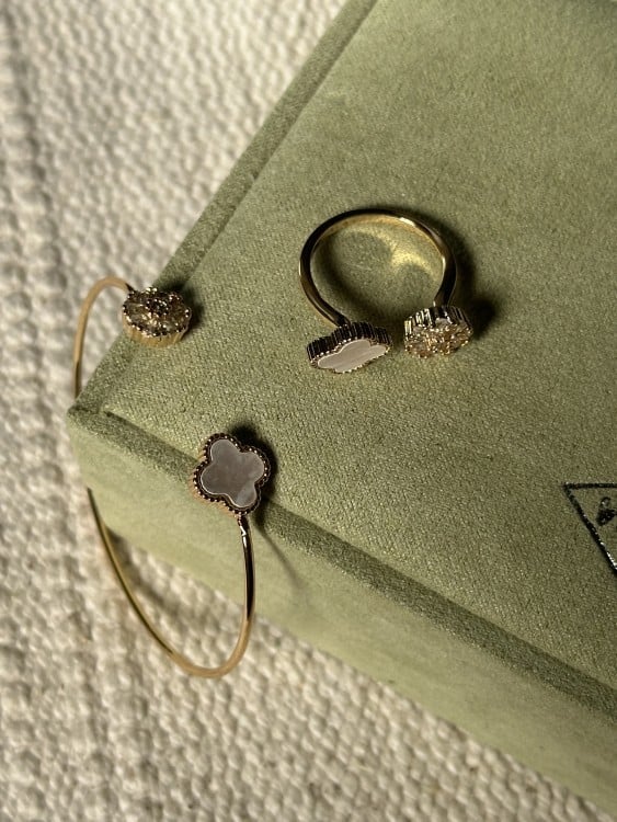 سوار وخاتم بتصميم فان كليف المميز يمتاز بحجر باللون الصدفي المميز