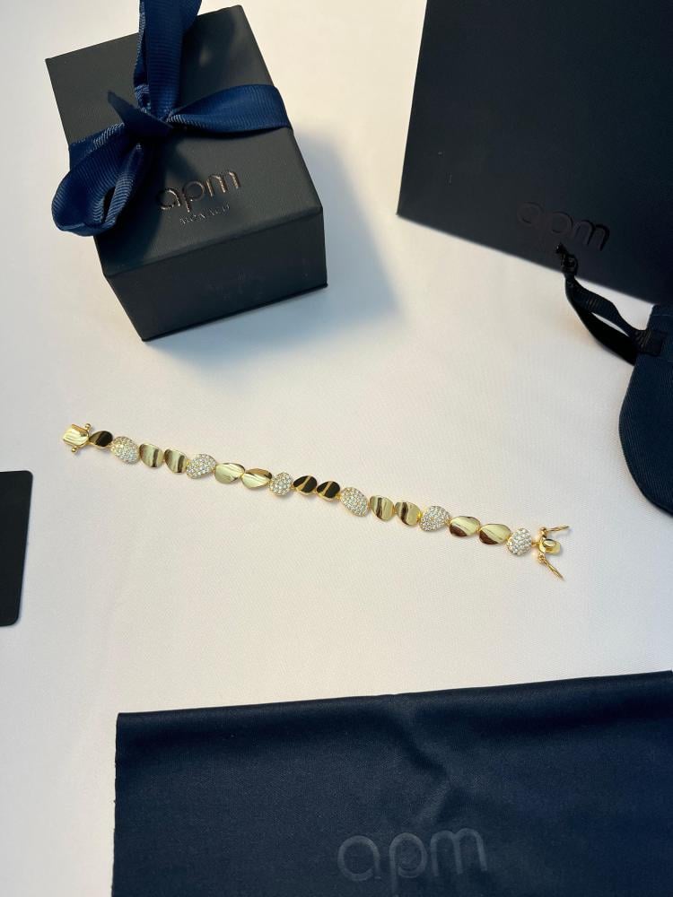 ارتقي بإطلالتك مع هذا السوار الذهبي الأنيق من APM Monaco، بتصميم مستوحى من الحصى الطبيعية اللامعة التي تجمع بين الفصوص البراقة واللمسات المعدنية اللامعة ليمنحك تألقاً يليق بذوقك الرفيع.
