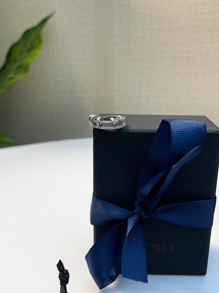 أضيفي بريقاً راقياً إلى إطلالتك مع هذا الخاتم الفضي المرصّع بالفصوص البراقة من APM Monaco. تصميمه العصري يجمع بين النعومة والفخامة بتفاصيل دقيقة تشبه قطع الماس، ليمنحك لمسة من الجاذبية في كل مناسبة.