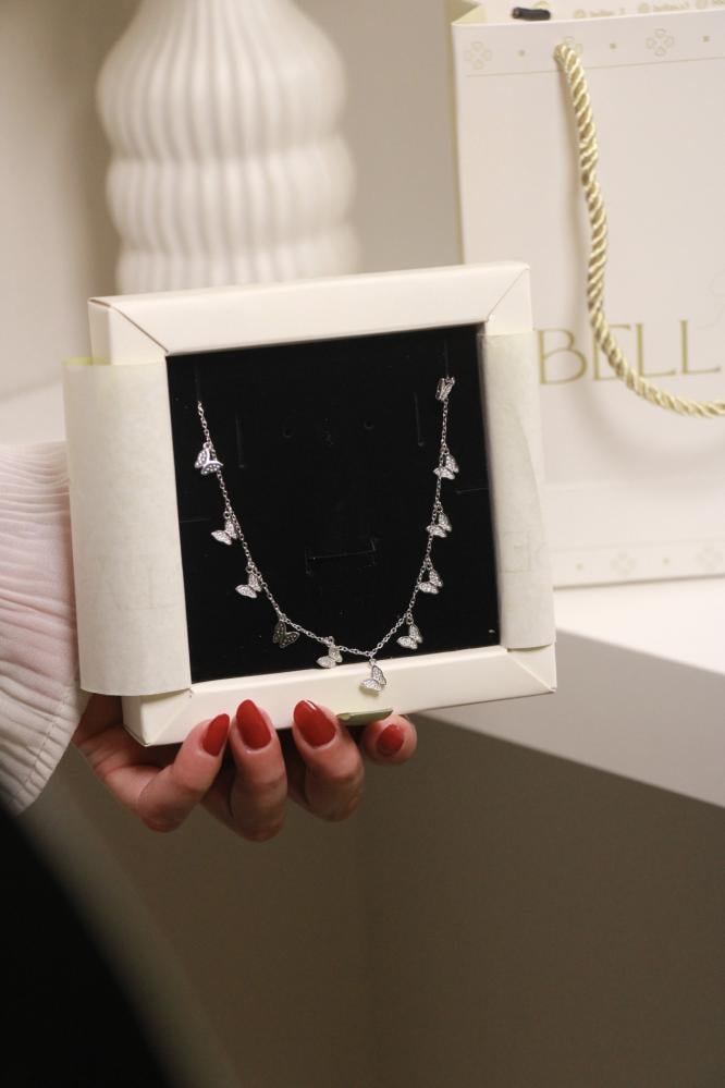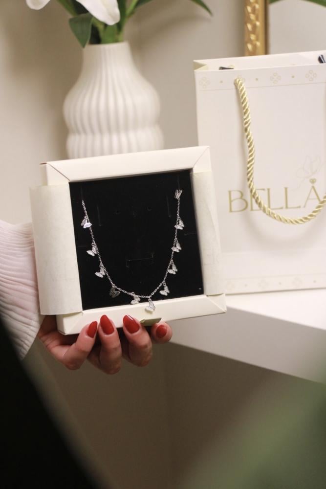 المصممة بدقة لتجسد الجمال والرقة في كل تفصيلة. تأتي هذه القلادة المزينة بأشكال فراشات متلألئة ومتناسقة مع أحجار براقة تضفي لمسة من النعومة والأنوثة على مظهرك. مصنوعة من أجود خامات الفضة الخالصة عيار 925، مما يضمن لك استمتاعاً طويلاً بجودتها ولمعانها الفريد.