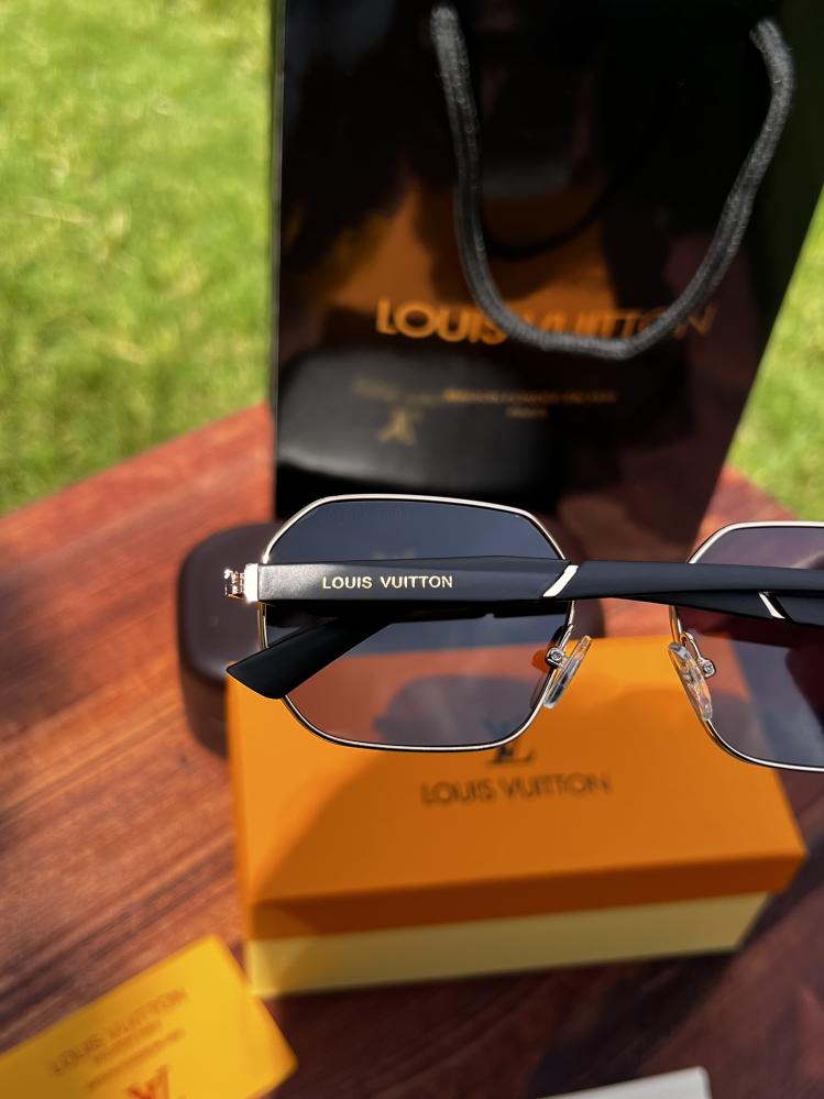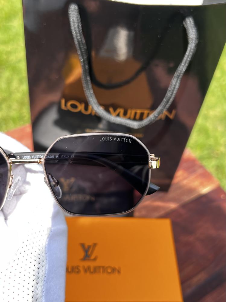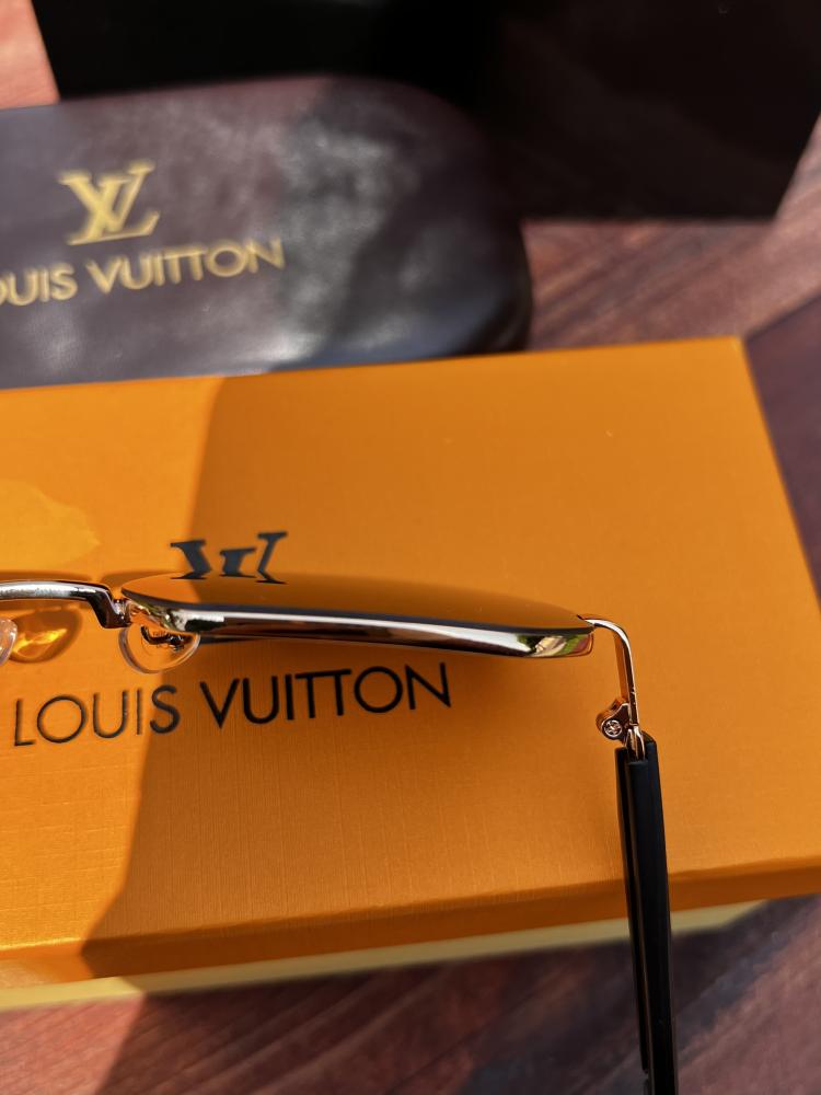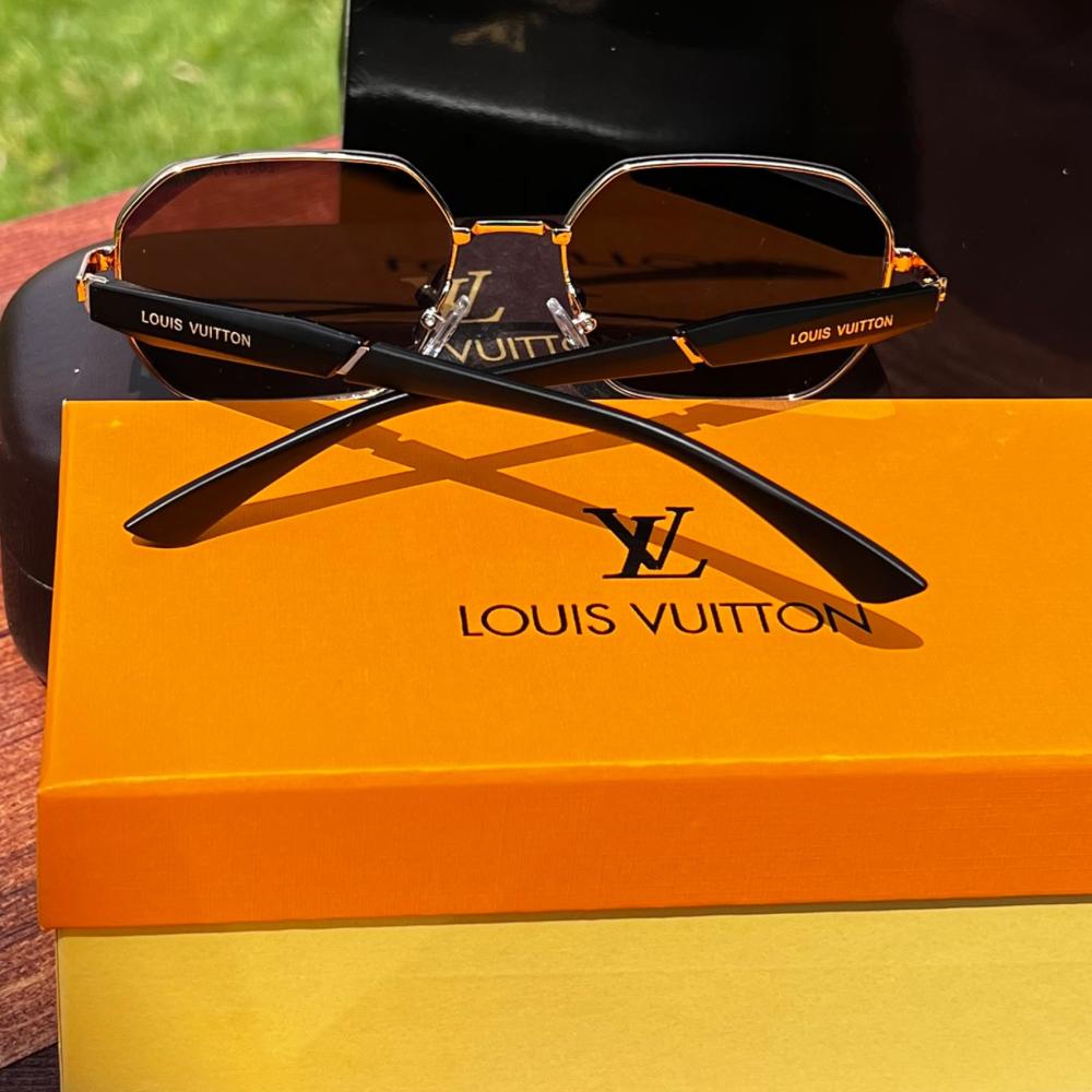 نظارة مستوحى من Louis Vuitton بتصميم فاخر يجمع بين الأناقة العصرية واللمسة الكلاسيكية. تأتي بإطار معدني باللون الذهبي مع ذراعين باللون الأسود المطفي يحملان نقش العلامة الفاخرة LOUIS VUITTON، لتمنحك مظهراً راقياً يناسب الإطلالات الرسمية والكاجوال.