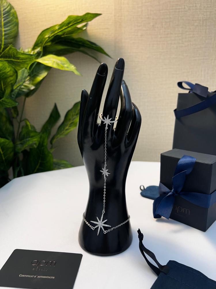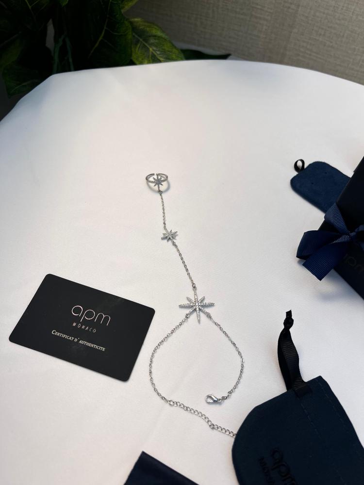 سوار APM Monaco الرفيع يجمع بين الخاتم والسوار بسلسلة أنيقة تتدلى منها نجوم متلألئة مرصعة بفصوص لامعة، لتمنح يديك لمسة من الفخامة والرقي في كل مناسبة.