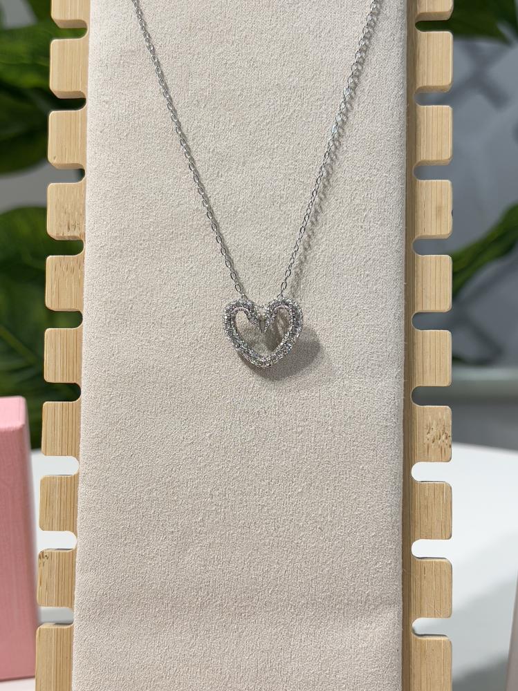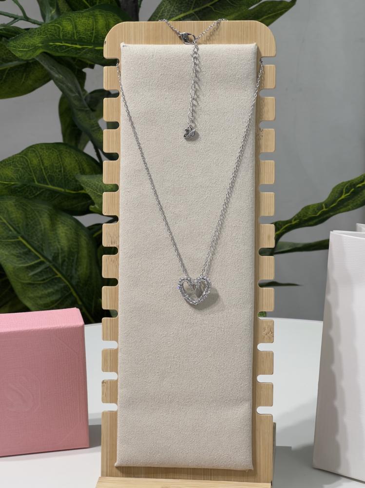 تتميز القلادة بحجر أنيقة الشكل في منتصفها، تحيط به كريستالات صغيرة مثبتة على إطار مطلي.