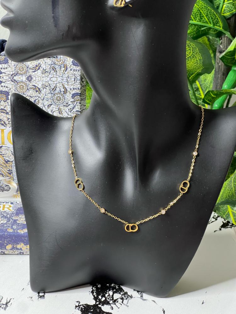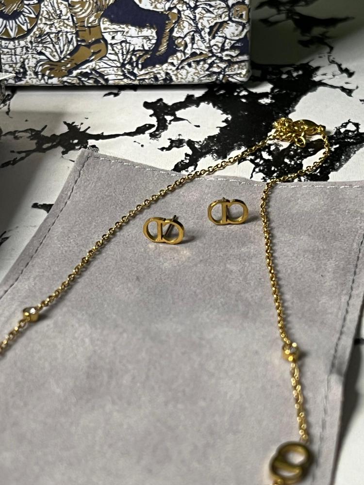 طقم فاخر من Dior بتصميم أنيق يجمع بين البساطة والرقي، يتكوّن من قلادة ناعمة وأقراط صغيرة بتصميم شعار Dior الأيقوني. يجسد هذا الطقم روح الأناقة الباريسية الراقية ويضفي لمسة من الفخامة على إطلالتك اليومية أو المسائية.